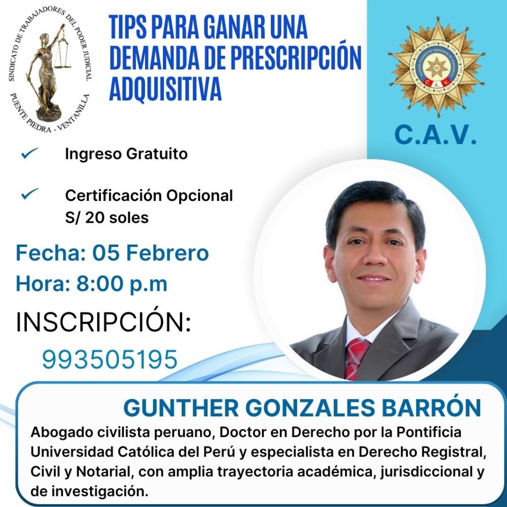 TIPS PARA GANAR UNA DEMANDA DE PRESCRIPCION ADQUISITIVA Jueves, 5 febrero · 8:00 – 9:00pm Regístrate y podrás acceder a la capacitación en el siguiente enlace: https://meet.google.com/ikj-qivn-jkc INSCRIPCIÓN Incríbete dando clic en el botón: INSCRIPCIÓN
